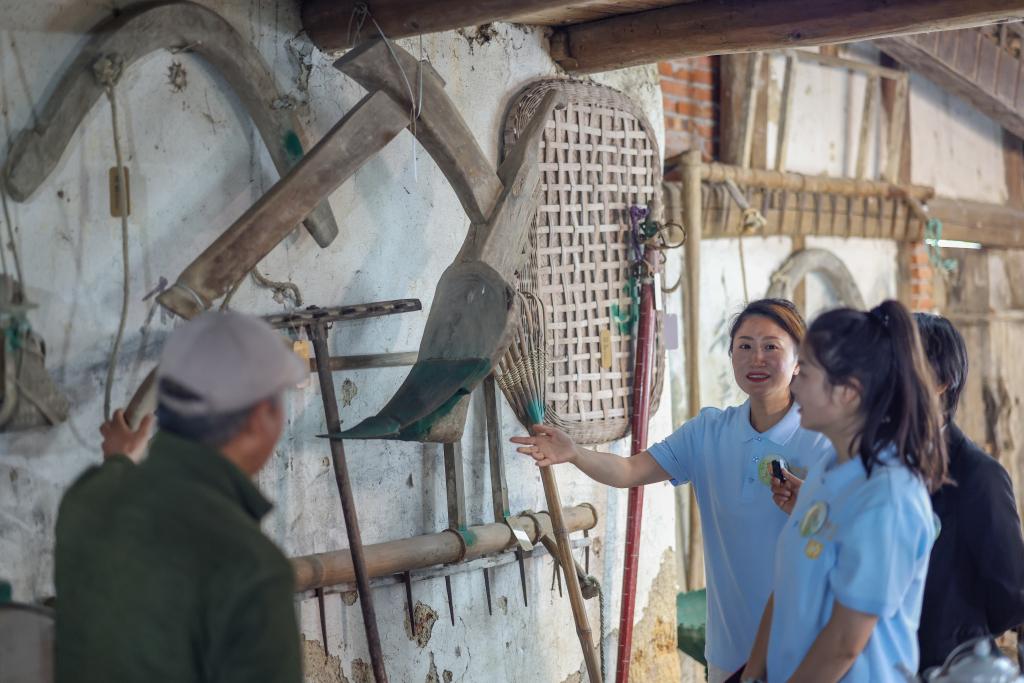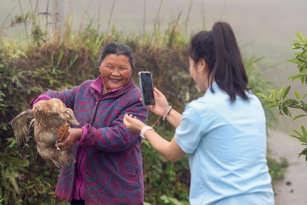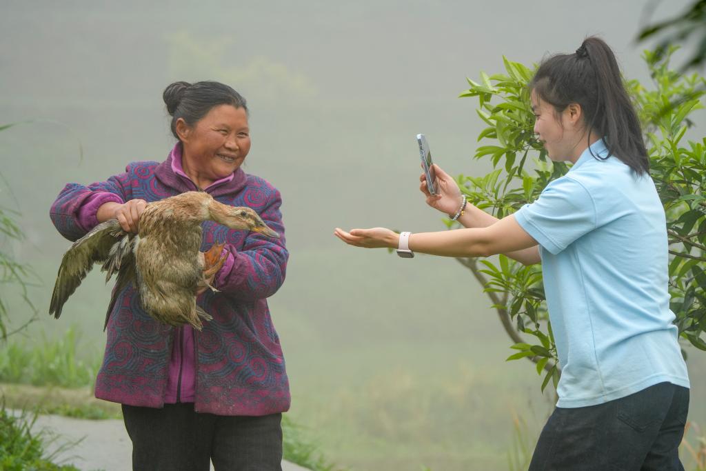 4月24日,在重慶市綦江區三角鎮中壩村,短視頻內容創作者龐芳(右)拍攝短視頻推介內容。新華社記者 黃偉 攝