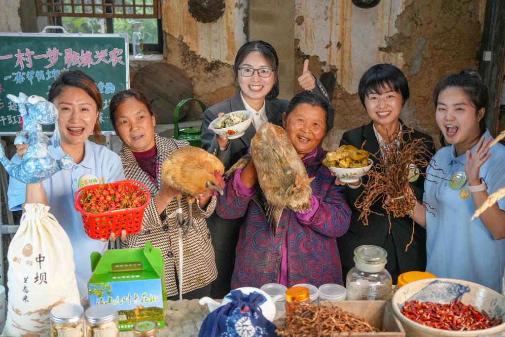 4月24日,在重慶市綦江區三角鎮中壩村,“村書記”主播團在直播間和村民一起推介鄉村土特産。新華社發(李曉果 攝)