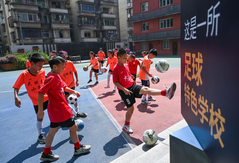 5月19日,重慶市大田灣小學,同學們參加足球大課間活動。新華社記者 陳誠 攝