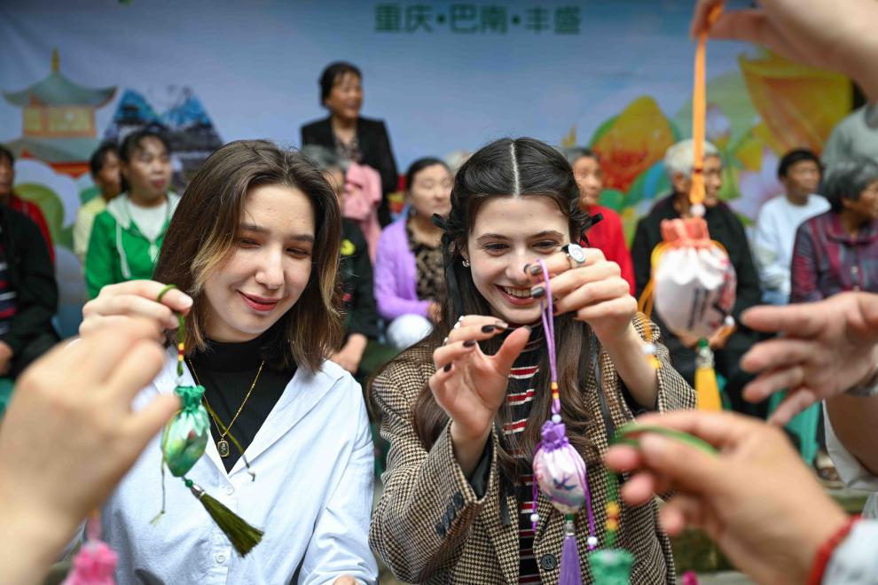 當日,重慶市巴南區豐盛古鎮洋溢着濃濃的節日氛圍,“粽情端午·幸福鄰里”活動在此拉開帷幕。200余名古鎮居民與來自重慶大學的俄羅斯、哈薩克斯坦留學生歡聚一堂,打糍粑、做香囊、品粽子、劃旱龍舟,共同體驗傳統端午習俗。