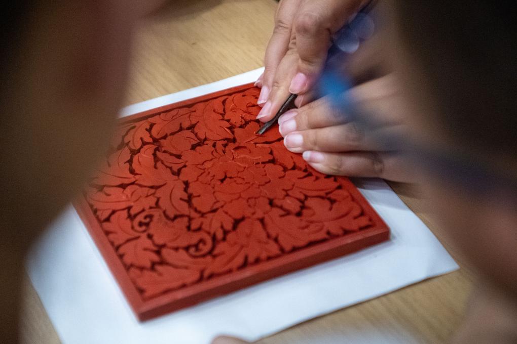 7月31日,在重慶市兩江新區大竹林街道竹林社區學院舉辦的文化藝術游園會活動上,工作人員劉翰音向小朋友展示雕漆技藝。