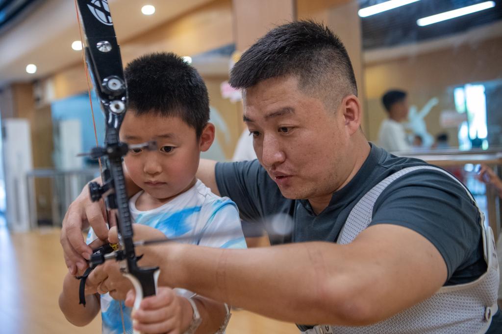7月31日,在重慶市兩江新區大竹林街道竹林社區學院舉辦的文化藝術游園會活動上,小朋友在工作人員尹佔旭(右)的指導下體驗射箭。