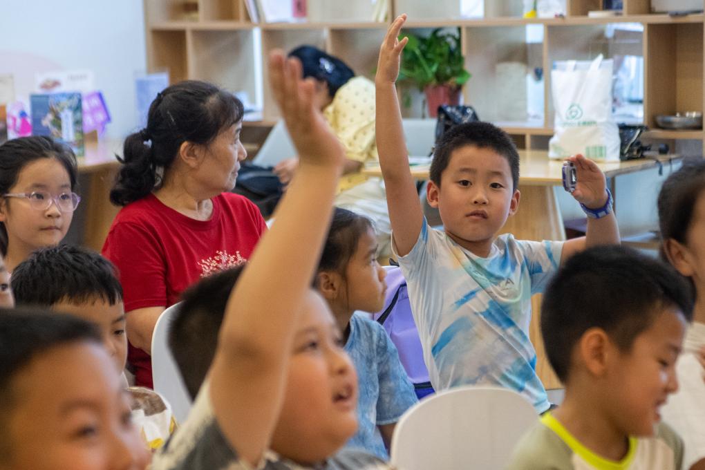 7月31日,在重慶市兩江新區大竹林街道竹林社區學院舉辦的文化藝術游園會活動上,小朋友舉手與老師互動。
