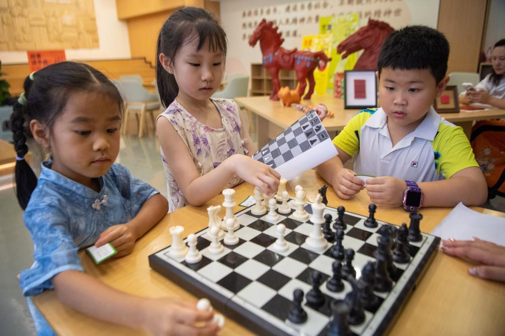 7月31日,小朋友在重慶市兩江新區大竹林街道竹林社區學院舉辦的文化藝術游園會活動上學習國際象棋。