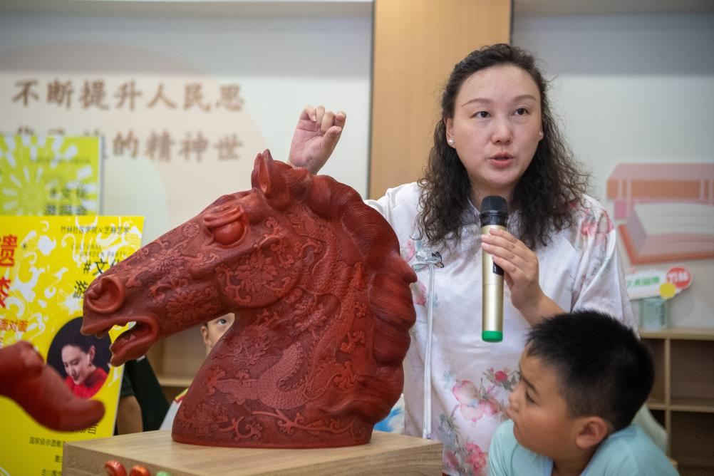 7月31日,在重慶市兩江新區大竹林街道竹林社區學院舉辦的文化藝術游園會活動上,工作人員劉翰音向小朋友和家長介紹雕漆技藝。