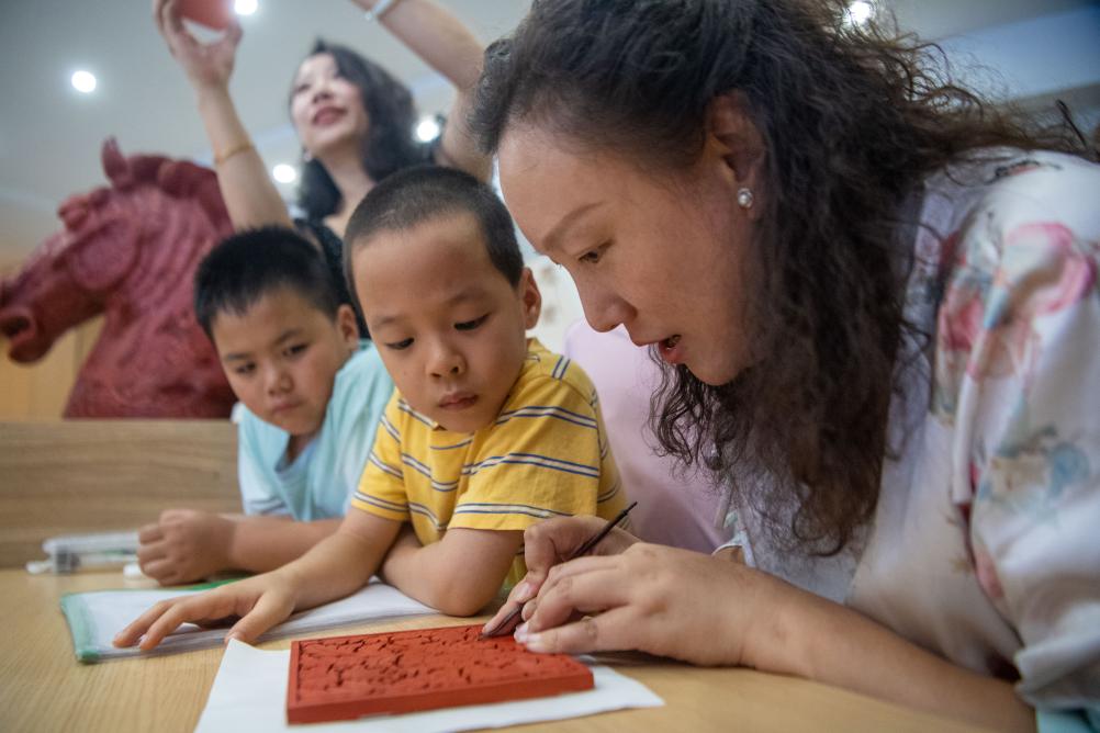 7月31日,在重慶市兩江新區大竹林街道竹林社區學院舉辦的文化藝術游園會活動上,工作人員劉翰音(右一)向小朋友展示雕漆技藝。