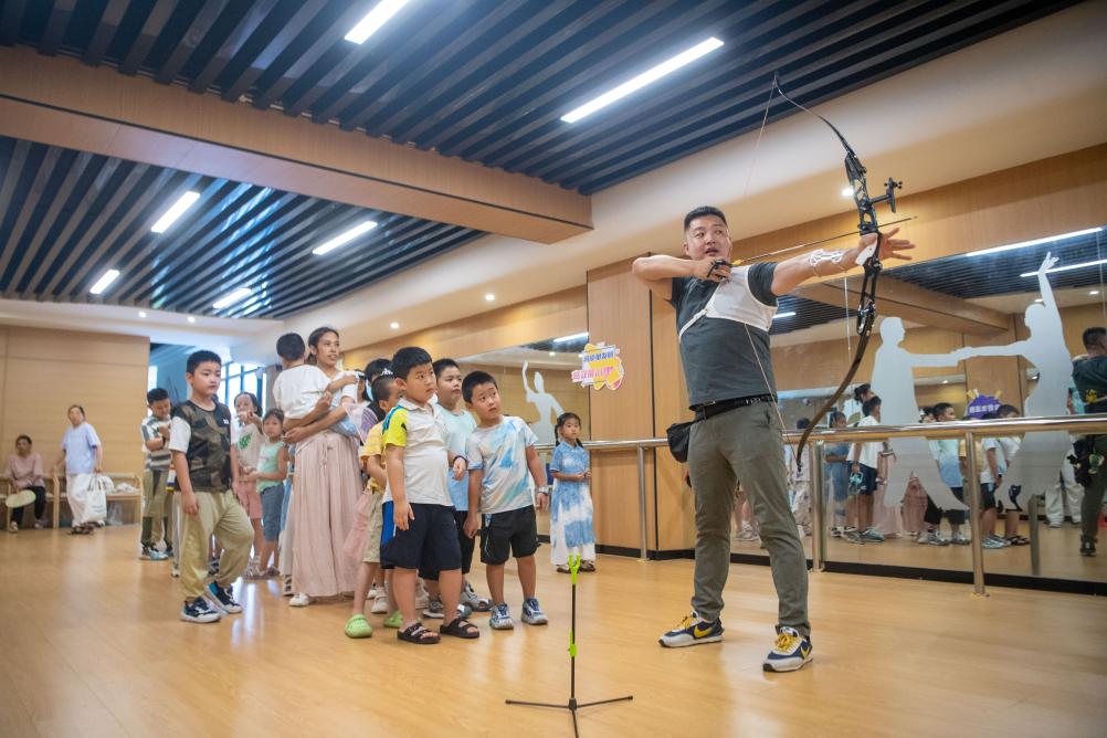 7月31日,在重慶市兩江新區大竹林街道竹林社區學院舉辦的文化藝術游園會活動上,工作人員尹佔旭(右一)向小朋友展示射箭技巧。