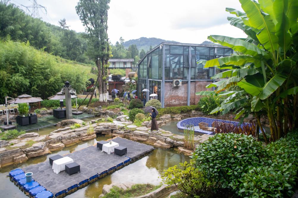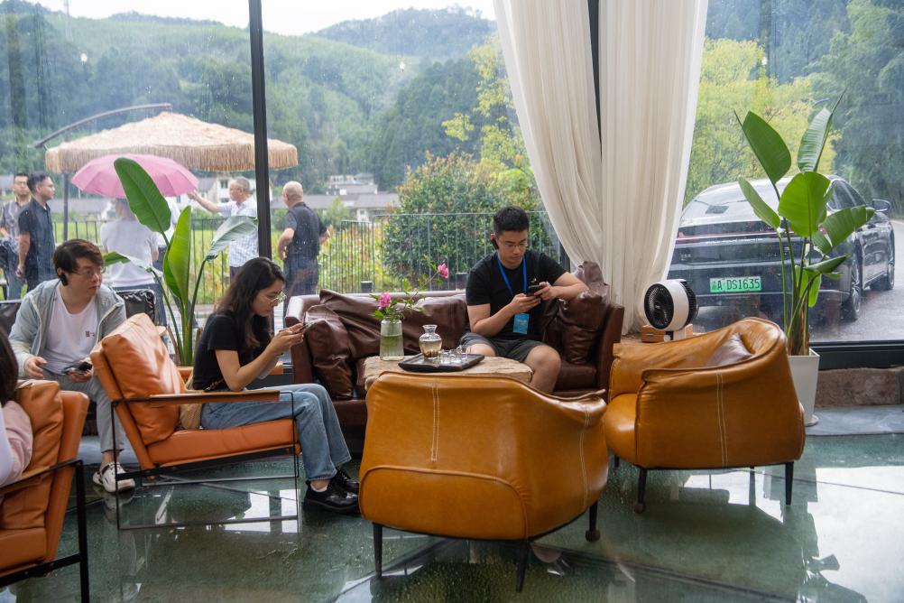 8月15日,人們在竹山鎮獵神村一處用礦山用房改造的咖啡館內休息。