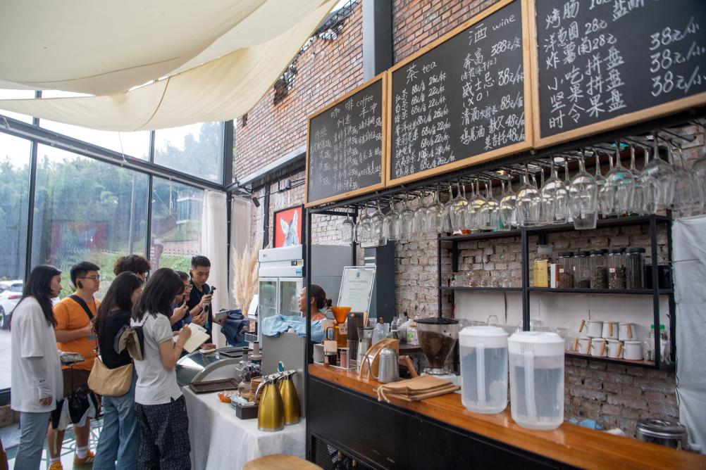 8月15日,在竹山鎮獵神村一處用礦山用房改造的咖啡館內,工作人員在介紹咖啡産品。