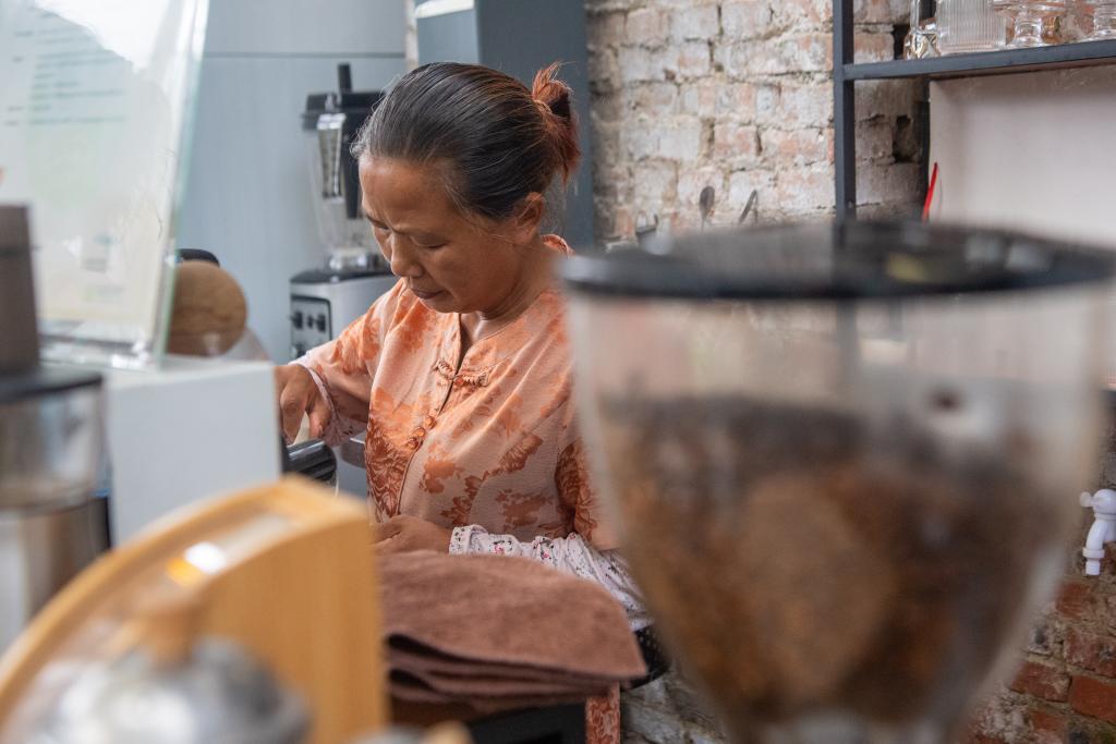 8月15日,在竹山鎮獵神村一處用礦山用房改造的咖啡館內,工作人員在製作咖啡。