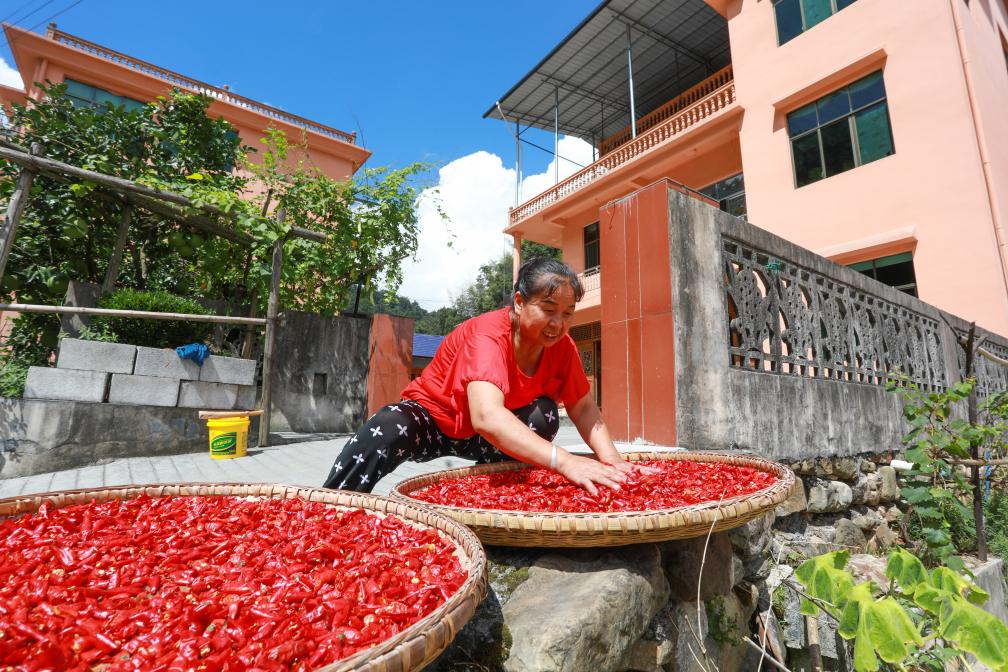 近日,重慶市秀山縣洪安鎮猛董村村民搶抓晴好天氣,在房前屋後忙着晾曬玉米、水稻、辣椒等農作物。