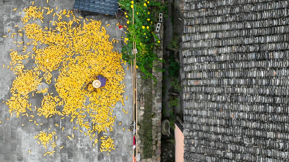 8月18日,猛董村村民在晾曬玉米(無人機照片)。
