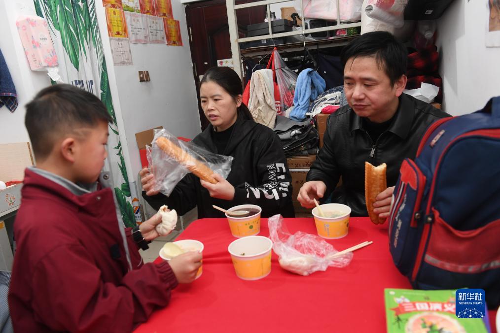 1月18日,楊梅和丈夫韋閃琪、兒子韋萌軒在工廠宿舍裏吃早飯。重慶人楊梅2007年來到織裏打工,在工廠碰到了機修工韋閃琪,兩人結婚生子,成了新織裏人。楊梅目前能勝任縫紉車間所有三十多道車縫工序,産品返工率極低,是一名優秀的縫紉工人。跟剛來時相比,車間的縫紉機已經升級了好幾代,也引入了生産管理智能系統以提升生産效率。跟以前走量為主的生産方式相比,“現在每一單單量小了、個性化強了,我還要不停學習來適應新的改變。”楊梅説。