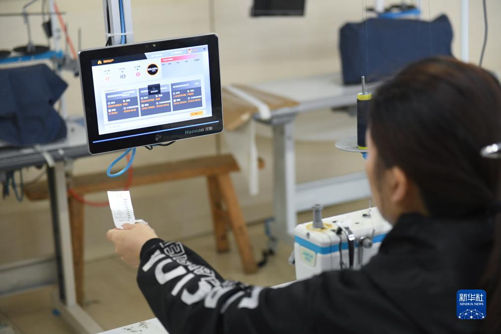 1月18日,楊梅在完成手上工序後通過生産智能系統掃描二維碼報工。重慶人楊梅2007年來到織裏打工,在工廠碰到了機修工韋閃琪,兩人結婚生子,成了新織裏人。楊梅目前能勝任縫紉車間所有三十多道車縫工序,産品返工率極低,是一名優秀的縫紉工人。跟剛來時相比,車間的縫紉機已經升級了好幾代,也引入了生産管理智能系統以提升生産效率。跟以前走量為主的生産方式相比,“現在每一單單量小了、個性化強了,我還要不停學習來適應新的改變。”楊梅説。