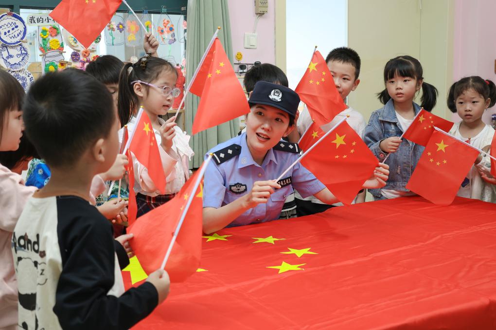 9月25日,浙江省台州市三門縣公安局珠岙派出所民警在鎮中心幼兒園給小朋友講國旗知識。