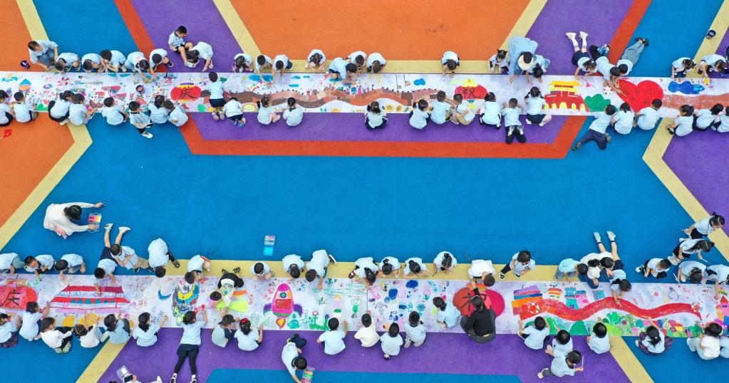 9月25日,浙江省台州市仙居縣中心幼兒園的孩子們在“繪長卷迎國慶”活動中繪畫(無人機照片)。