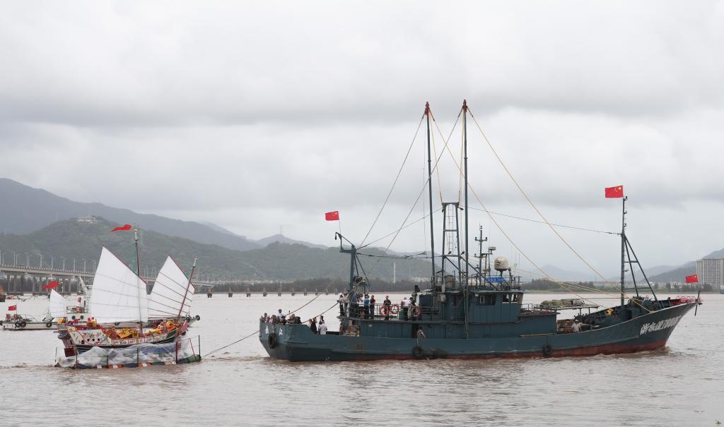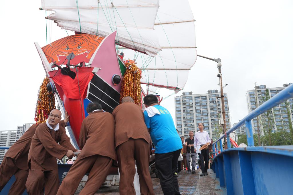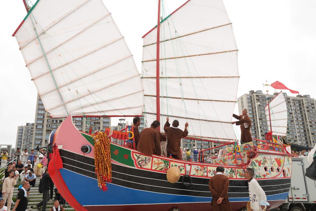 7月22日,當地民眾給即將下水的“大暑船”張起船帆。