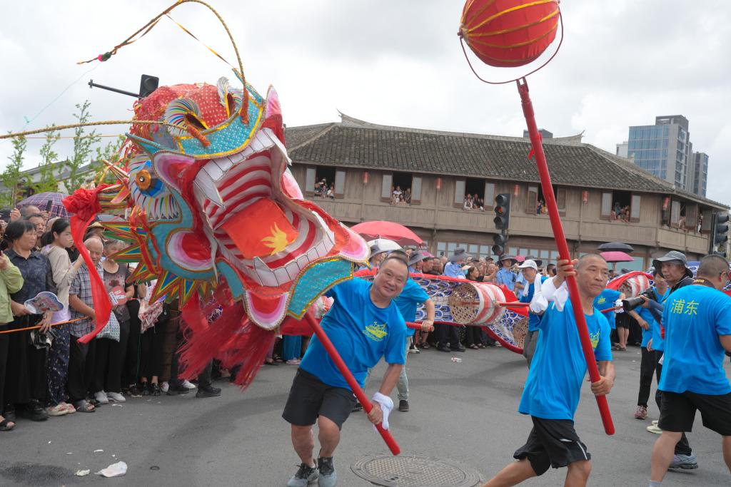 7月22日,當地民眾在“送大暑船”的游行隊列中進行舞龍表演。