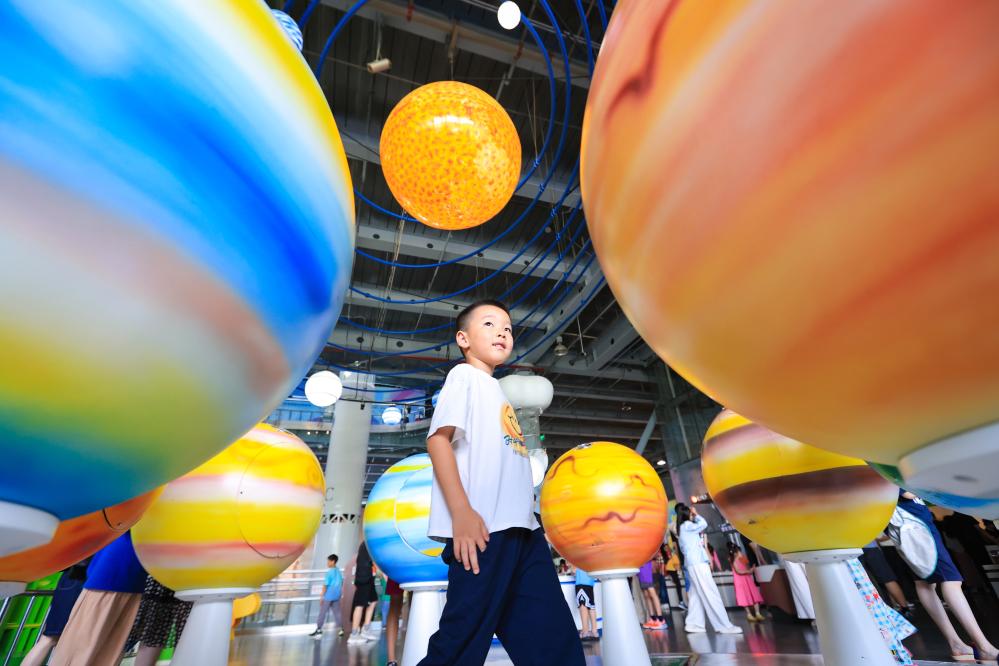 7月26日,小朋友在南京科技館觀看科普裝置。