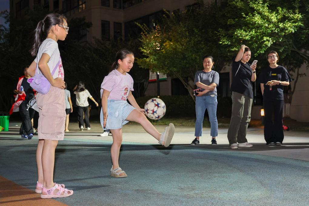 7月25日晚,在江蘇省無錫市梁溪區瞻江街道萬融社區舉辦的消夏運動會上,小朋友參與顛足球比賽。