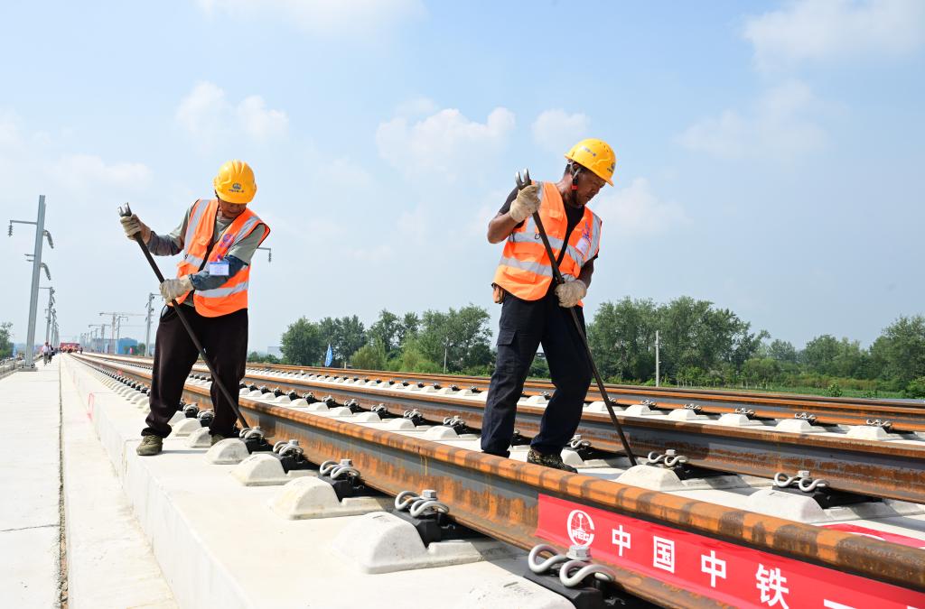 8月6日,中鐵一局施工人員在淮宿蚌城際鐵路鋪軌施工現場作業。
