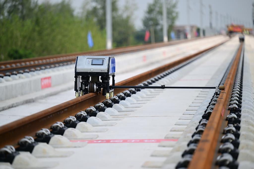 8月6日,智能螺栓機在淮宿蚌城際鐵路鋪軌施工現場自動作業。