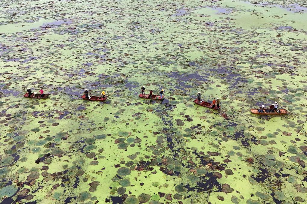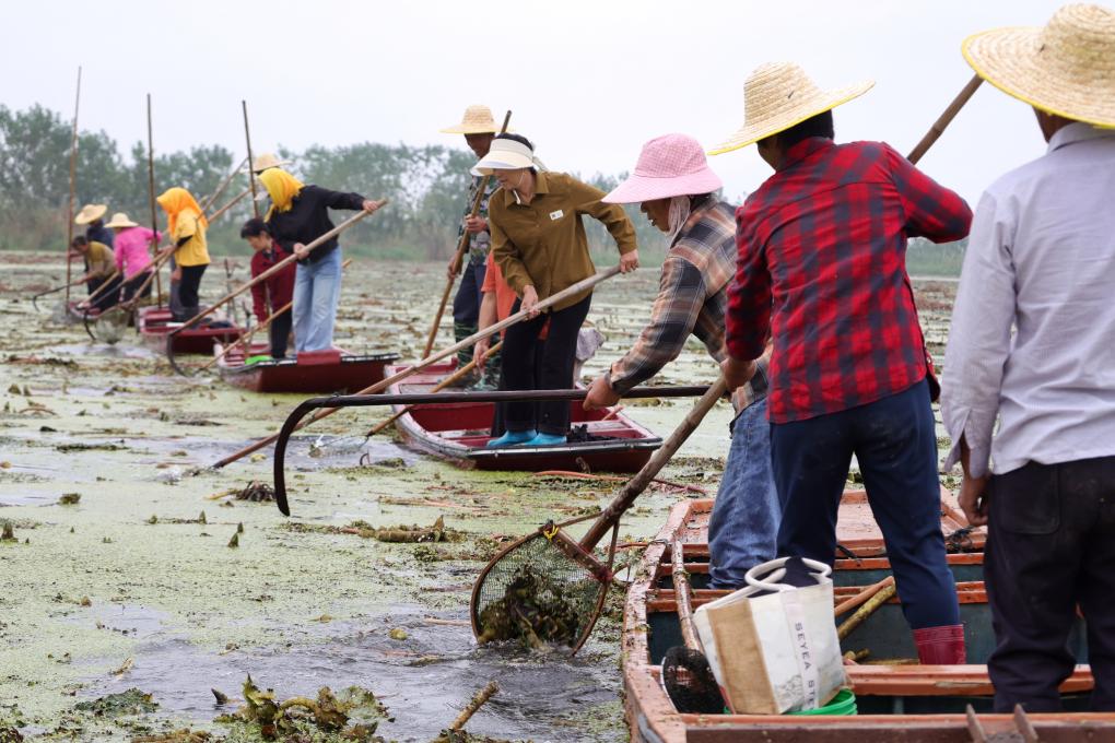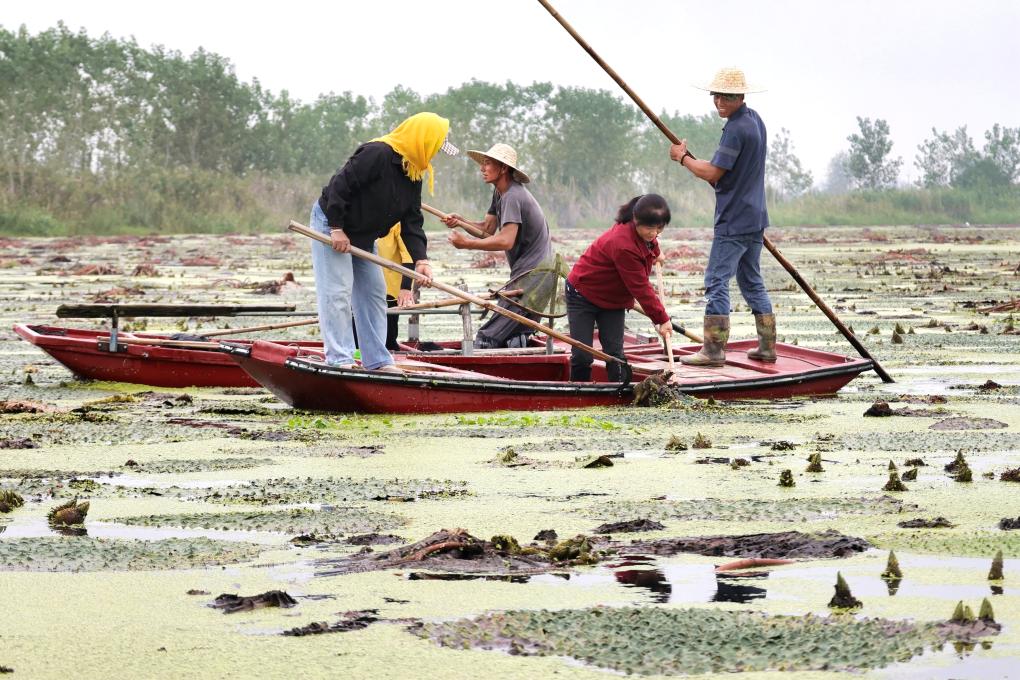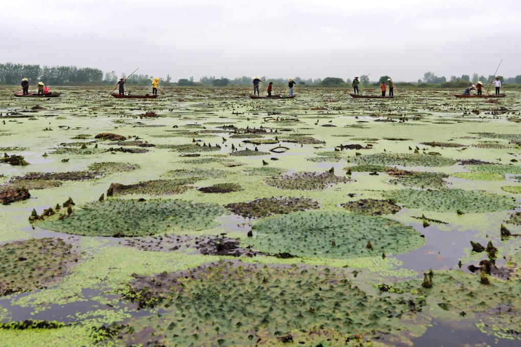 ↑2025年10月13日,江蘇省鹽城市建湖縣九龍口鎮九龍口村村民在采收芡實。CICPHOTO/李根 攝