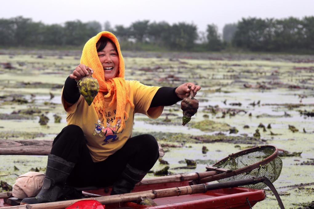 ↑2025年10月13日,江蘇省鹽城市建湖縣九龍口鎮九龍口村村民在展示采收的芡實。CICPHOTO/李根 攝 編輯:武興