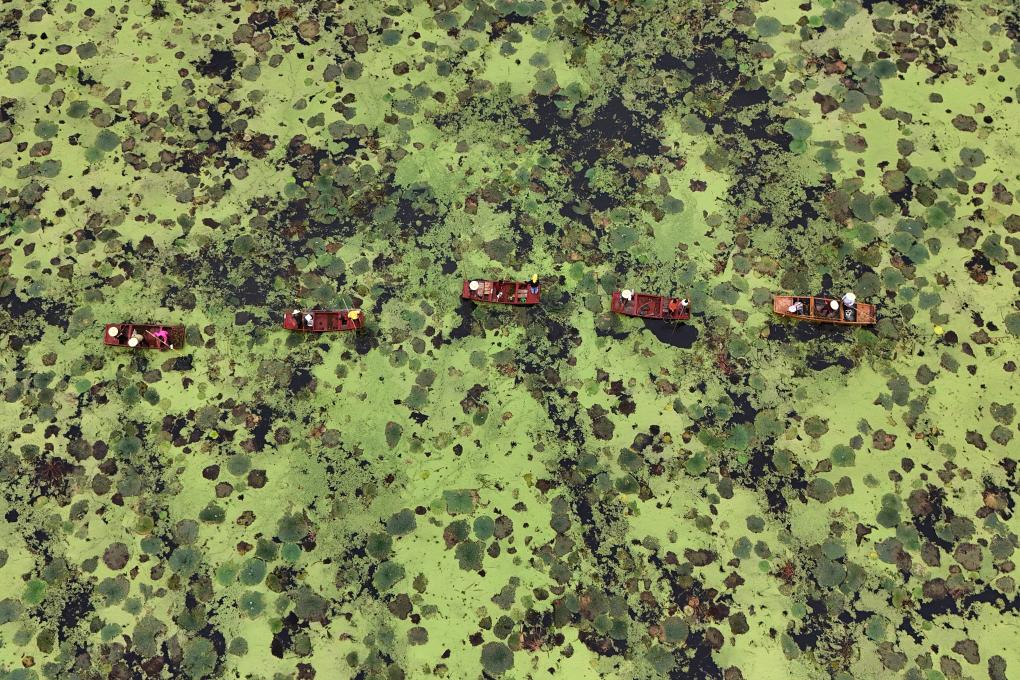 ↑2025年10月13日,江蘇省鹽城市建湖縣九龍口鎮九龍口村村民在采收芡實。(無人機拍攝)CICPHOTO/李根 攝