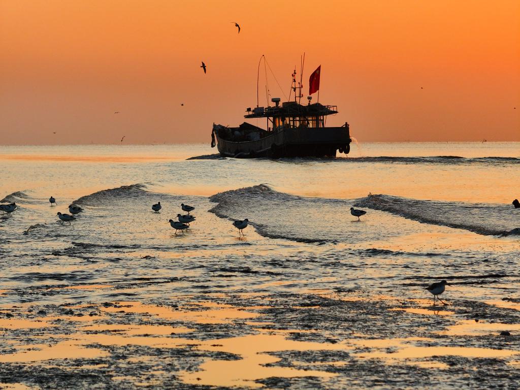 11月19日,海鳥在江蘇省連雲港市贛榆區沿海濕地裏覓食(無人機照片)。