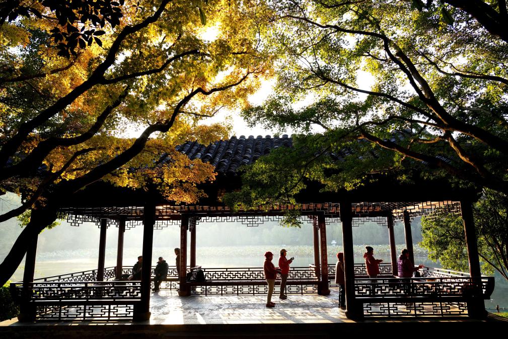 11月21日,人們在杭州西湖綠水芙蕖亭中晨練。