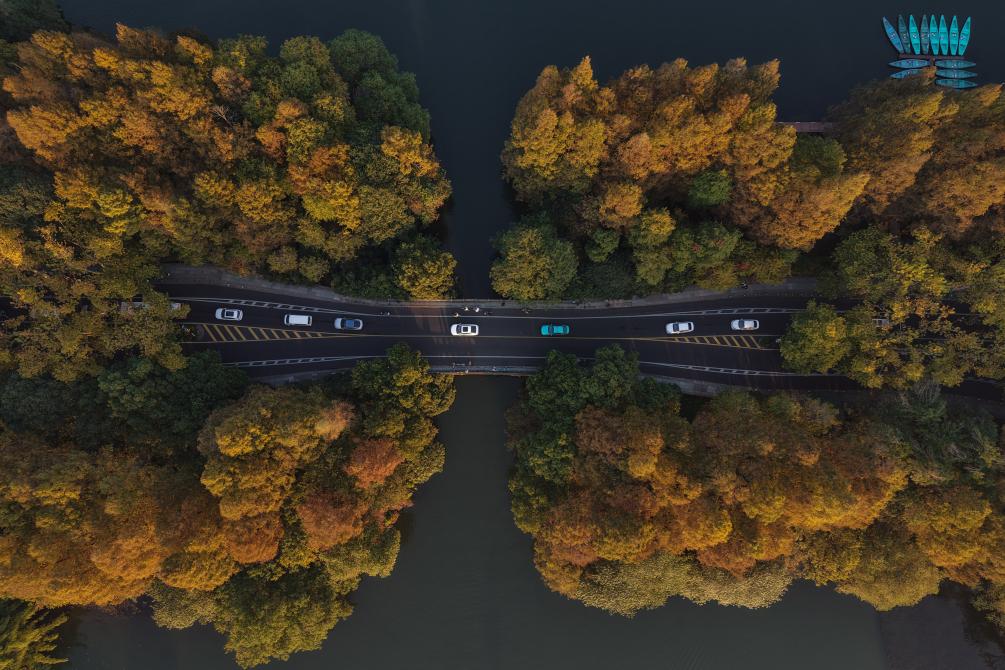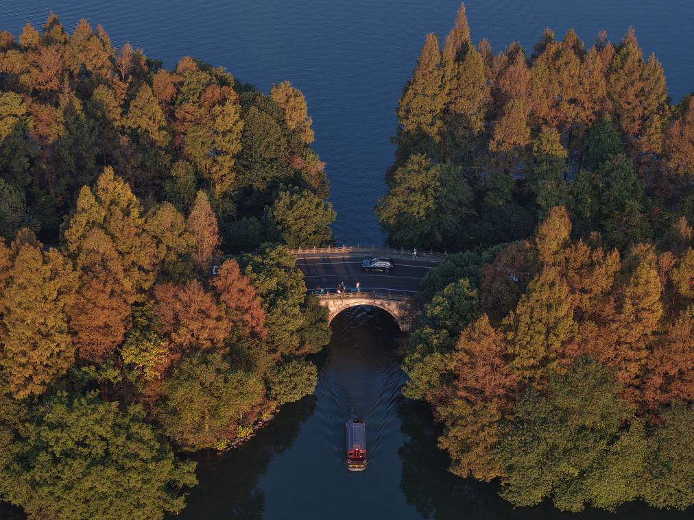 11月21日,汽車行駛在杭州西湖景區的楊公堤上,游客乘船從橋下穿過(無人機照片)。