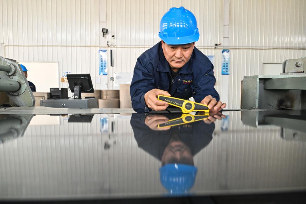 11月25日,在蘇州新穎新材料科技股份有限公司冰箱面板自動化生産線,工人測量産品漆膜厚度。