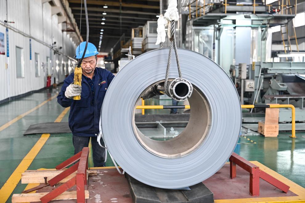 11月25日,在蘇州新穎新材料科技股份有限公司,工人吊運冰箱面板半成品。