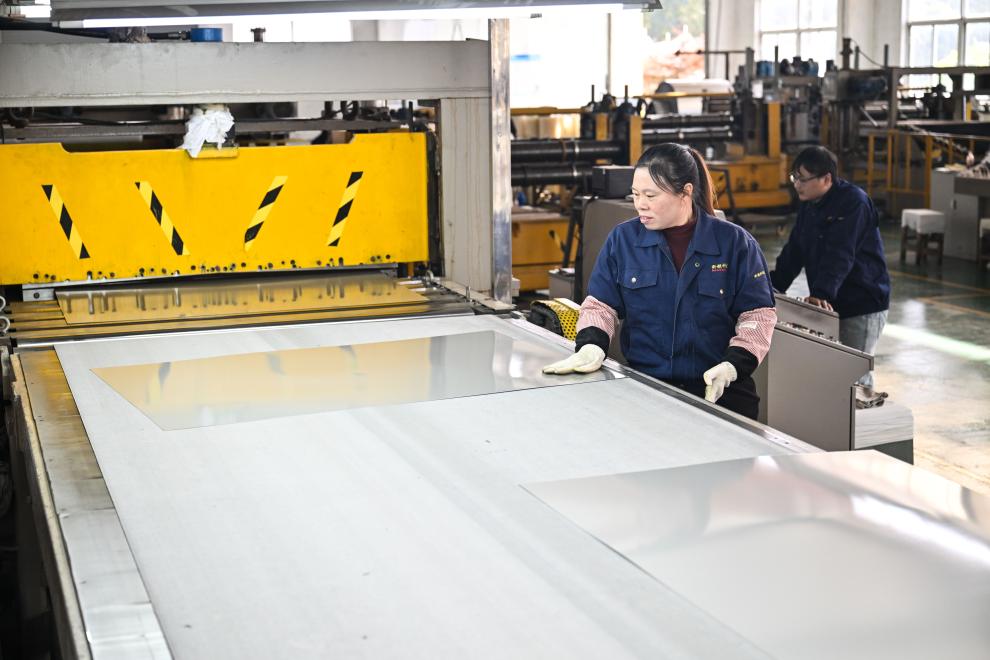 11月25日,在蘇州新穎新材料科技股份有限公司,工人對冰箱面板成品進行質檢。