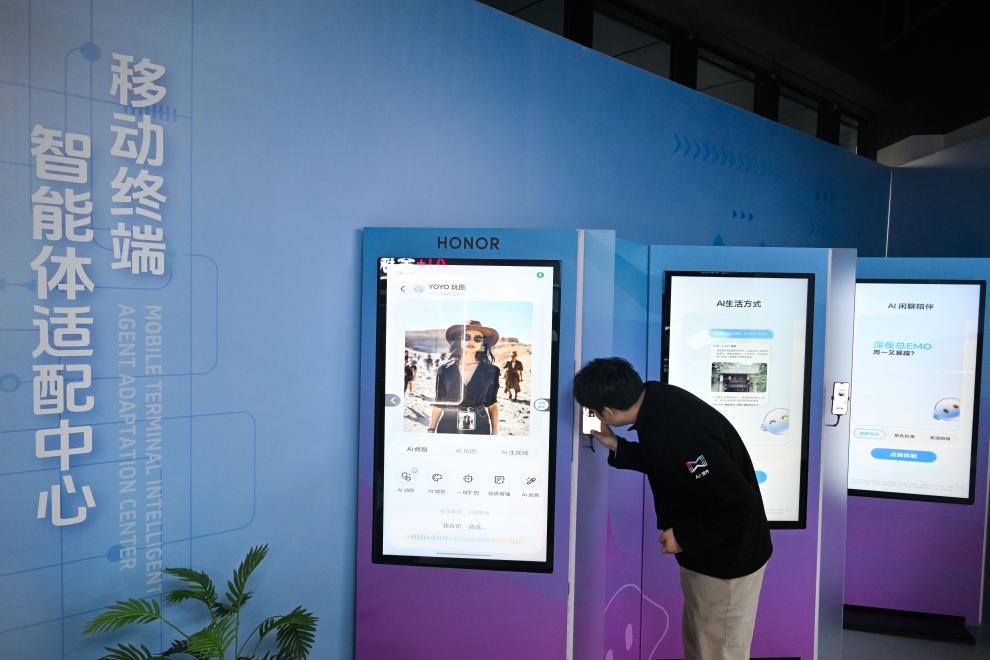12月4日,在南京人工智能生態街區的“AI·模坊”南京智能體集散中心,工作人員與智能移動終端互動。