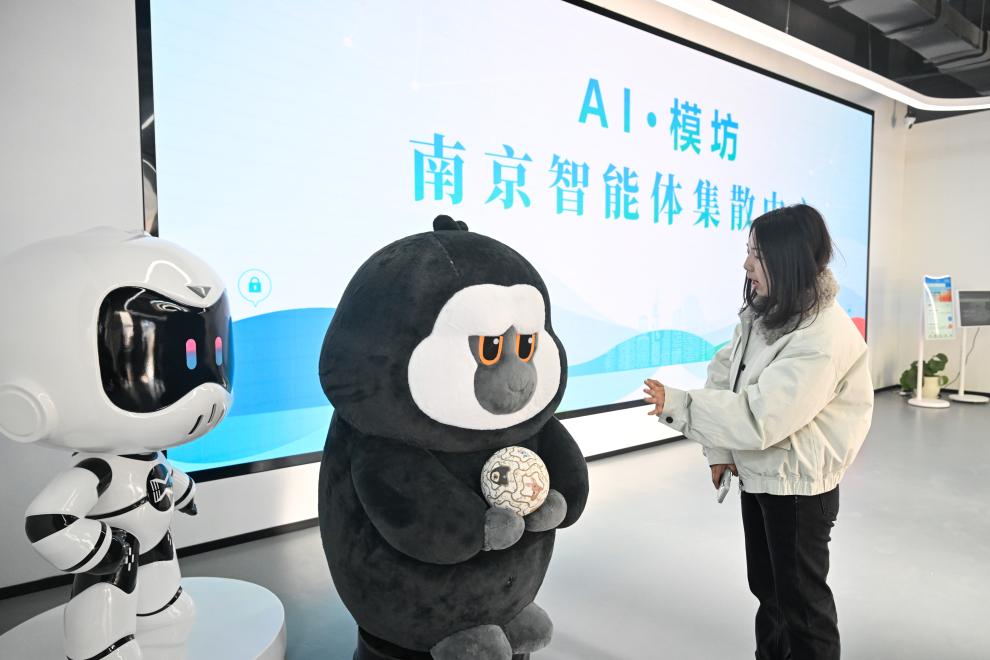 12月4日,在南京人工智能生態街區的“AI·模坊”南京智能體集散中心,一位女士與機器人互動。