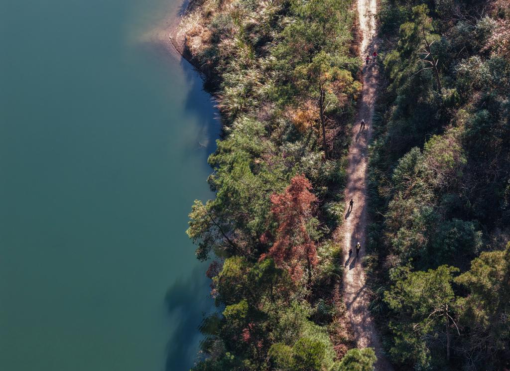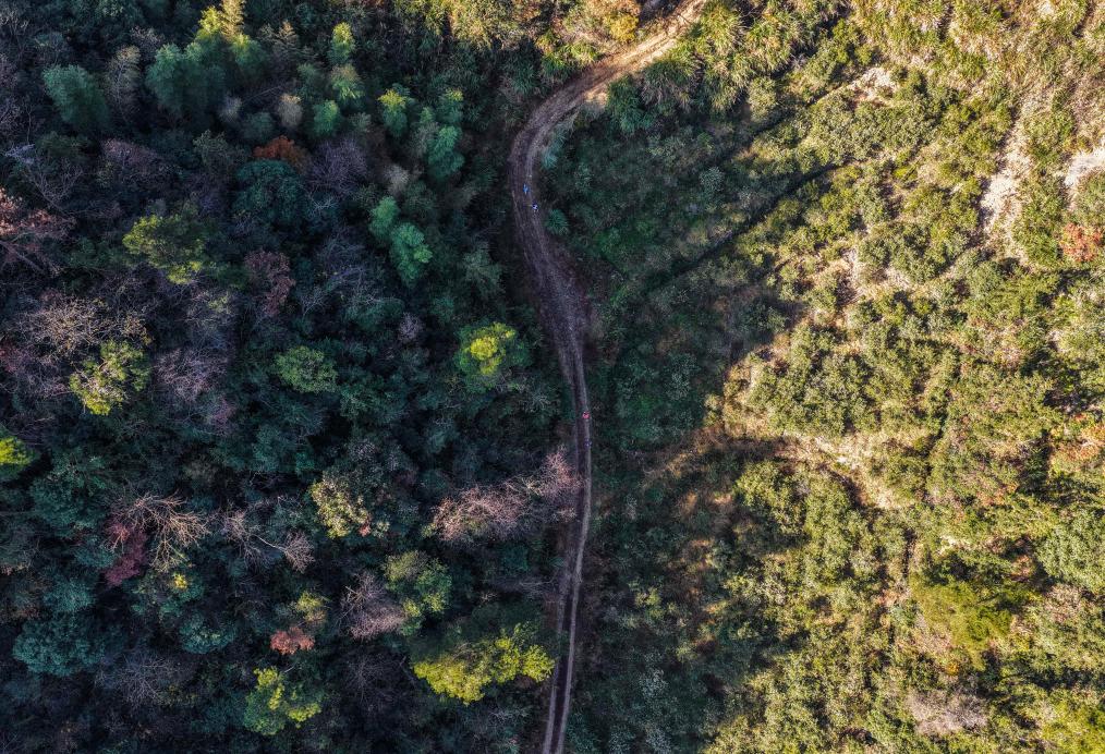 12月7日,參賽選手們在山林間奔跑(無人機照片)。