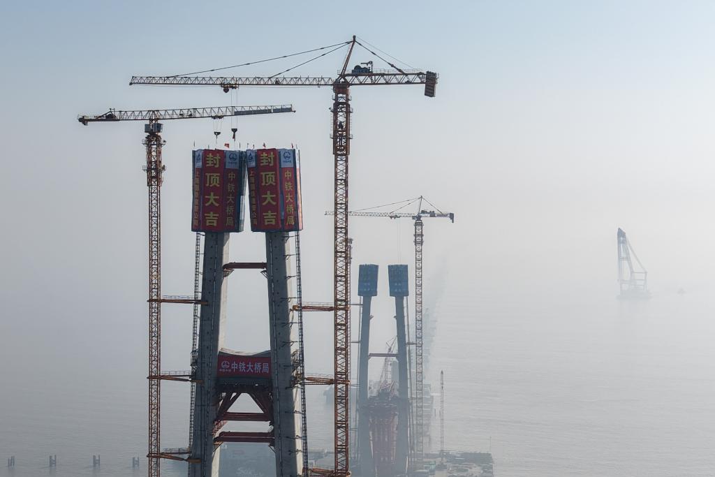 1月16日,在浙江杭州灣海鹽側離岸約0.4公里的海面上,由上海國鐵建管公司建設管理、中鐵大橋局承建的北航道橋高達200米的8號主塔成功封頂。這是大橋全線三座航道橋、七座主塔中首座封頂的主塔,標誌着這一超級工程建設取得重大階段性進展。