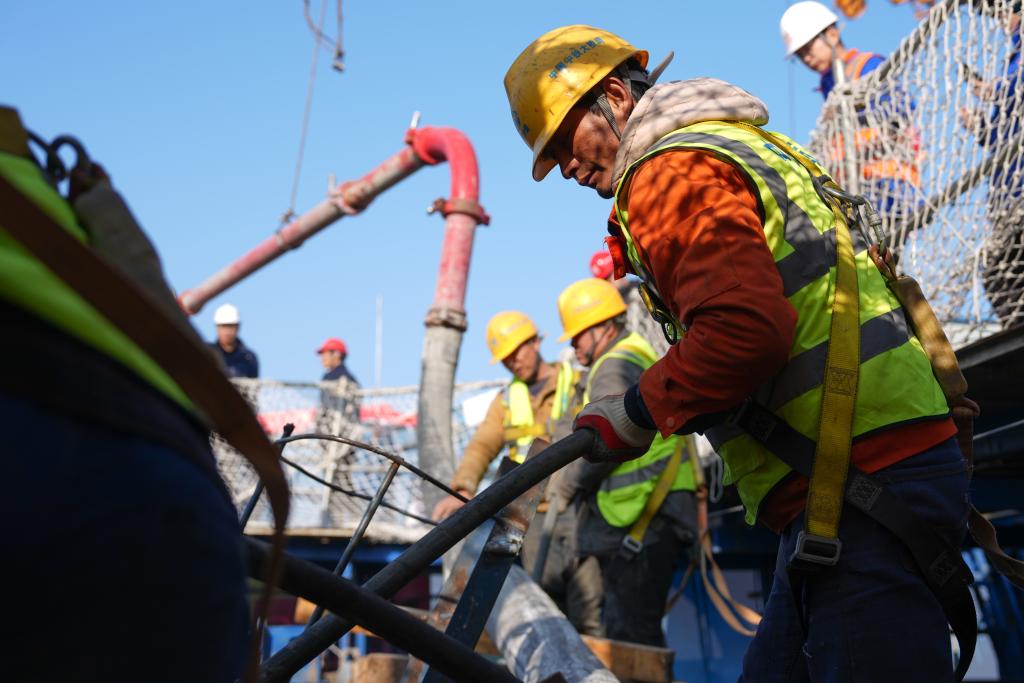 1月16日,中鐵大橋局建設者在杭州灣跨海鐵路橋北航道橋8號主塔封頂施工現場作業。