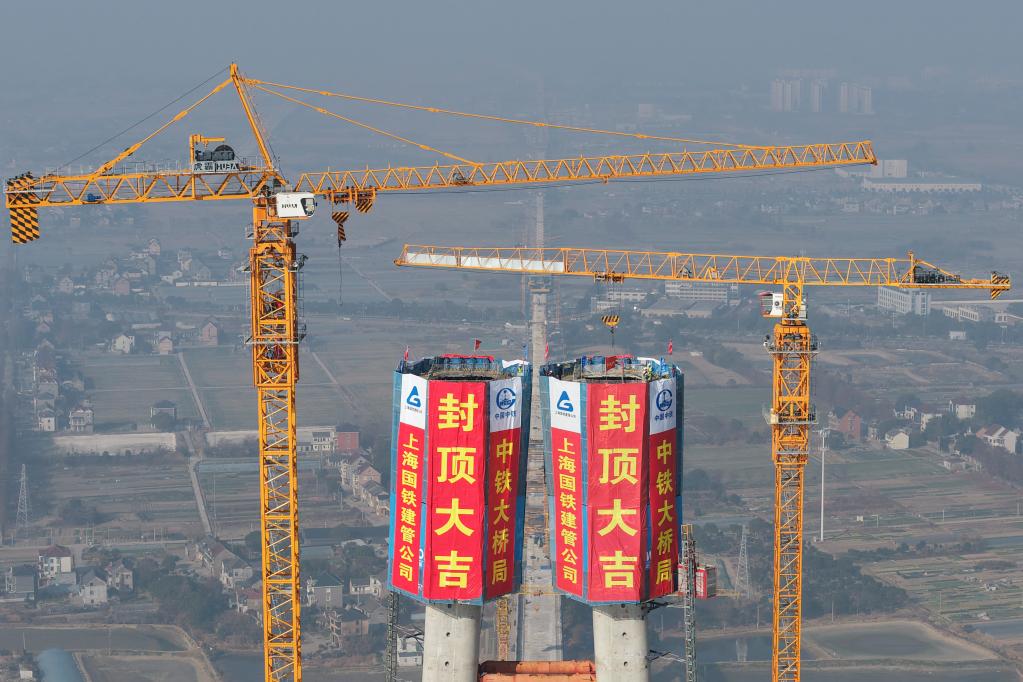 1月16日拍攝的杭州灣跨海鐵路橋北航道橋8號主塔封頂施工現場(無人機照片)。