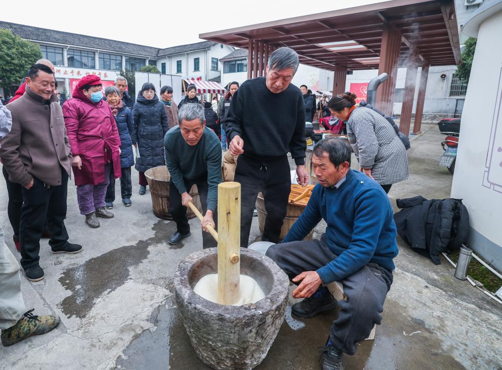 1月23日,村民們在東白湖鎮鄉村年味大集現場打麻糍。