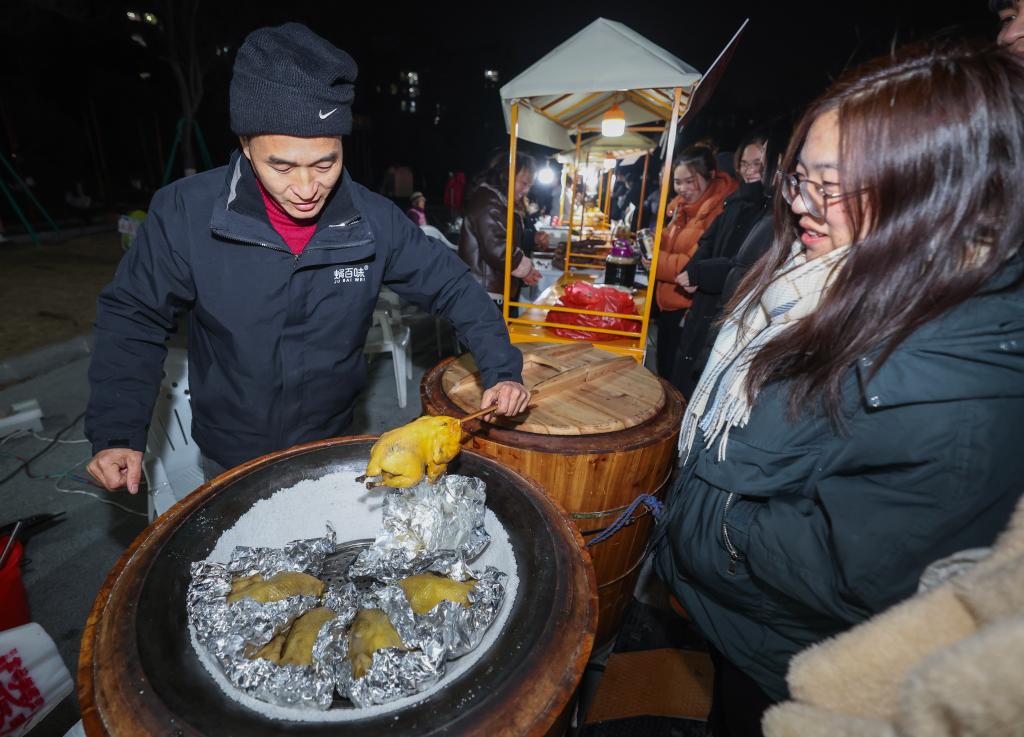 1月23日,在陶朱街道友誼社區王家湖公園的共富市集上,攤主給顧客介紹特色鹽焗雞。