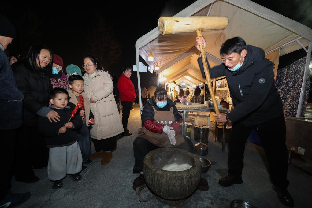 1月23日,在陶朱街道友誼社區王家湖公園的共富市集上,攤主在現場打年糕。