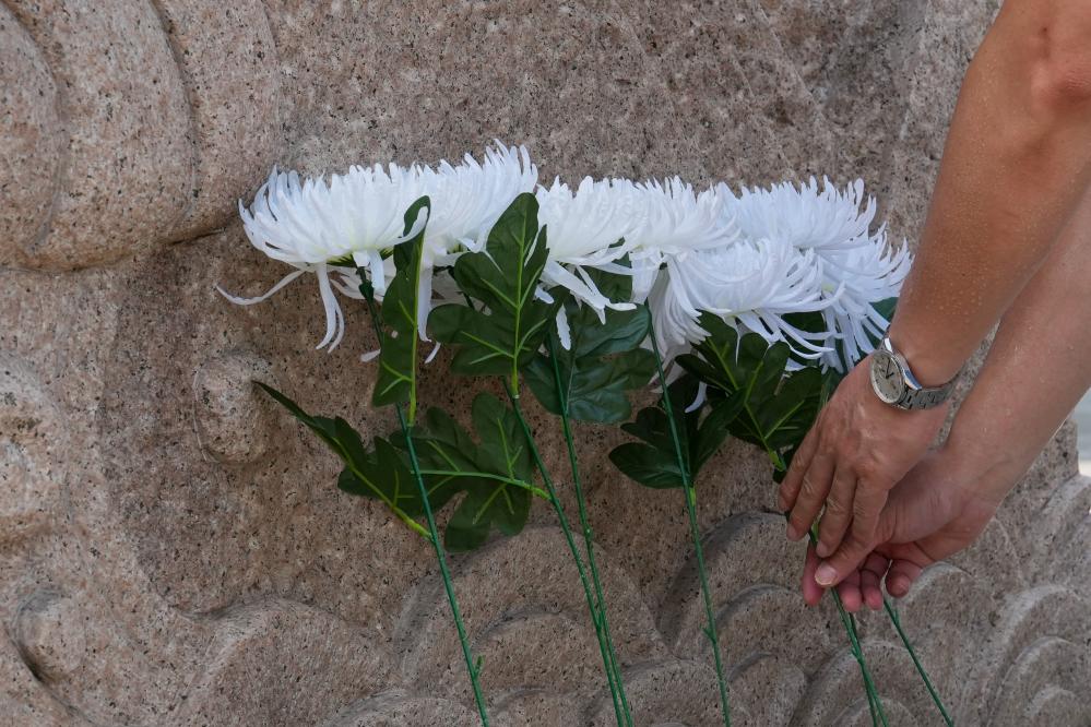 7月7日,觀眾在南京抗日航空烈士紀念館紀念碑前獻花,緬懷英烈。