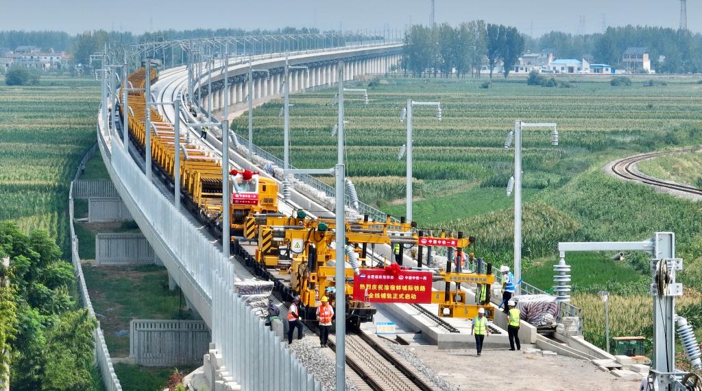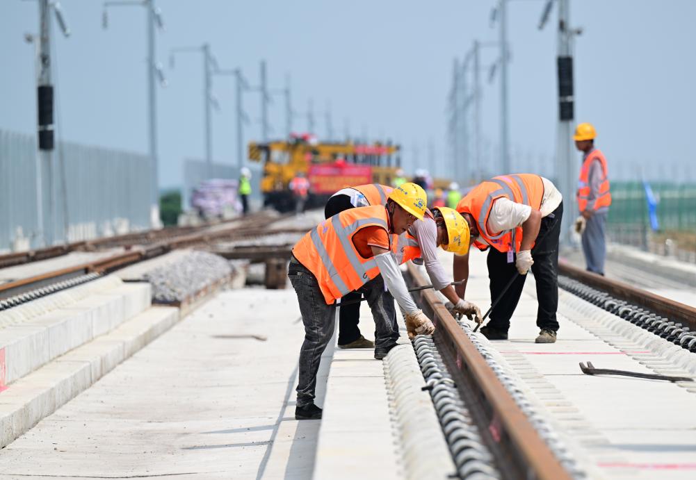8月6日,中鐵一局施工人員在淮宿蚌城際鐵路鋪軌施工現場作業。