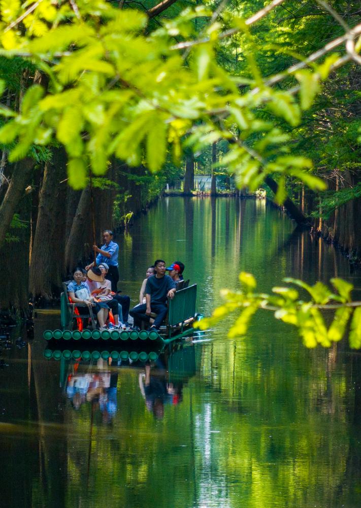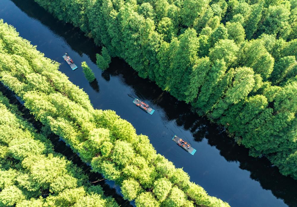 8月30日,游人在江蘇省淮安市金湖縣水上森林景區乘坐竹筏游覽美景(無人機照片)。