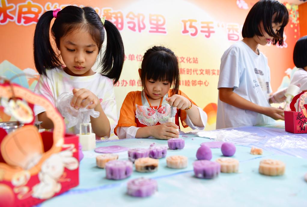 10月5日,在江蘇省無錫經開區太湖街道方廟社區舉辦的迎中秋主題活動上,小朋友體驗製作月餅。