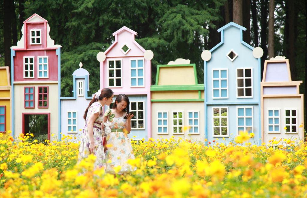 10月5日,人們在南京中山植物園盛開的黃秋英花叢中賞花游玩。