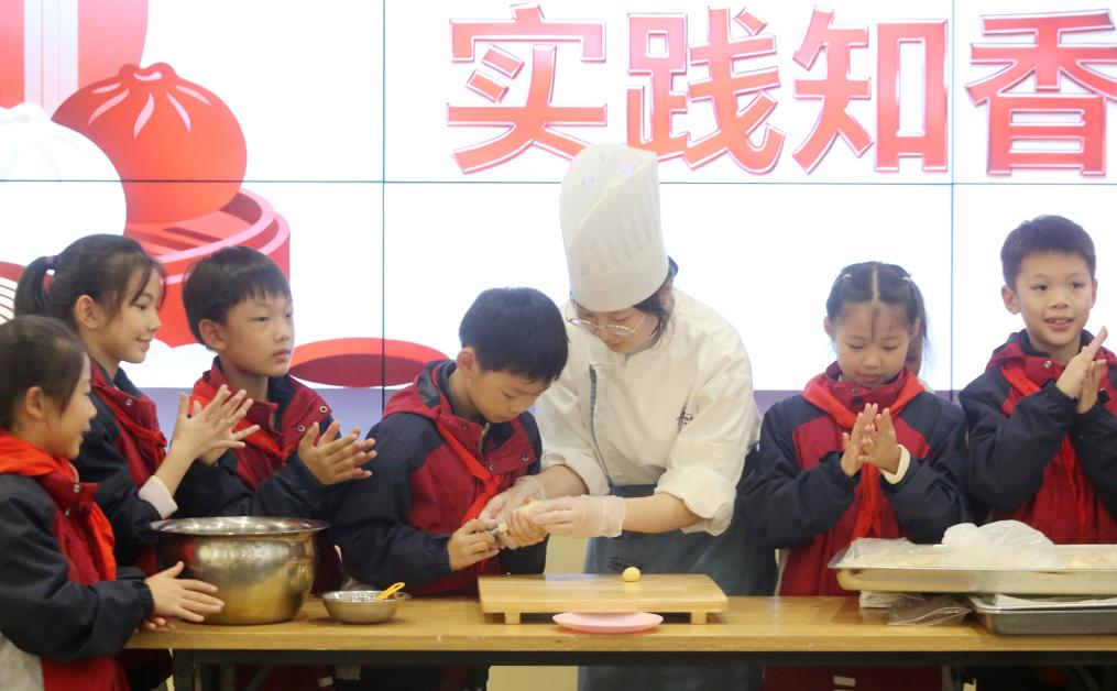 10月28日,在位於江蘇揚州的中國淮揚菜博物館,糕點師指導小學生製作重陽糕。